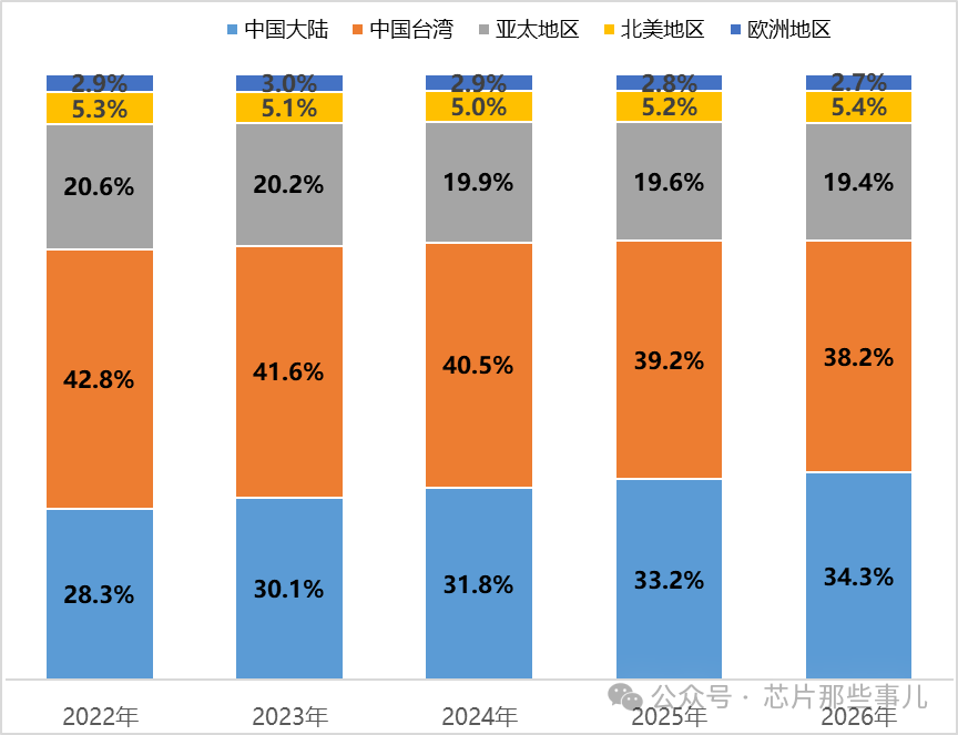 聚焦于中國(guó)市場(chǎng),2022年中國(guó)大陸在全球晶圓代工產(chǎn)能中的份額超過(guò)了72%,處于這一領(lǐng)域內(nèi)的絕對(duì)領(lǐng)先地位,月度產(chǎn)能超過(guò)750萬(wàn)片。據(jù)預(yù)測(cè),到2026年時(shí),中國(guó)大陸地區(qū)的晶圓代工月產(chǎn)能有望超越400萬(wàn)片,占全球總量的比例將達(dá)到34.4%,期間預(yù)計(jì)實(shí)現(xiàn)年均復(fù)合增長(zhǎng)率高達(dá)13.4%,成為世界上增速最快的區(qū)域之一。值得注意的是,中國(guó)臺(tái)灣地區(qū)代工產(chǎn)能始終保持全球領(lǐng)先,但由于臺(tái)積電調(diào)整了其投資建廠的戰(zhàn)略方向,導(dǎo)致該地區(qū)在全球市場(chǎng)上的份額呈現(xiàn)逐年遞減的趨勢(shì)。