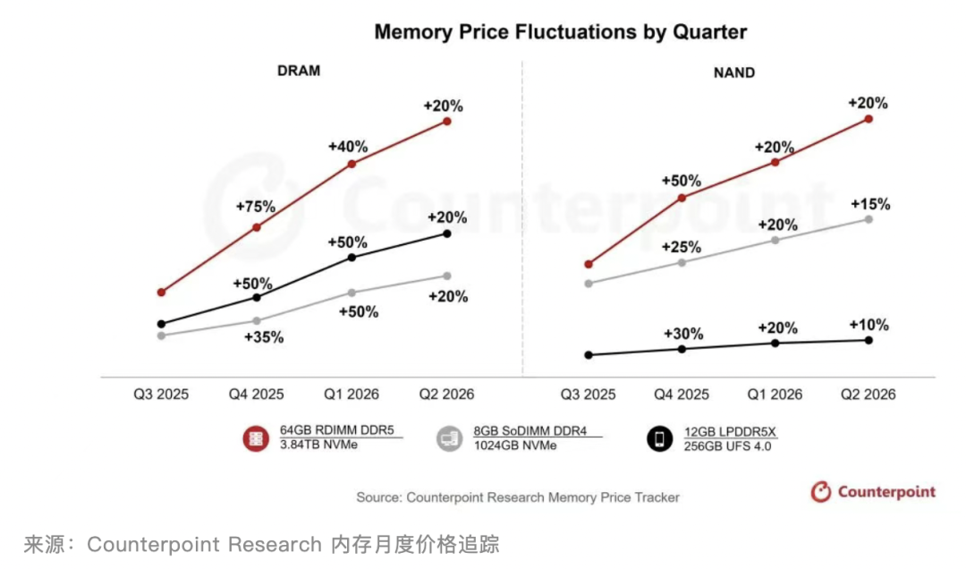 作為內(nèi)存核心組件的存儲芯片,價格同步開啟飆升模式。據(jù)市場研究機構(gòu)Counterpoint Research發(fā)布最新行業(yè)報告指出,2025年四季度內(nèi)存價格將飆升40%-50%,預(yù)計2026年一季度還將再漲40%–50%,二季度預(yù)計再上漲約20%,整體漲勢未改。