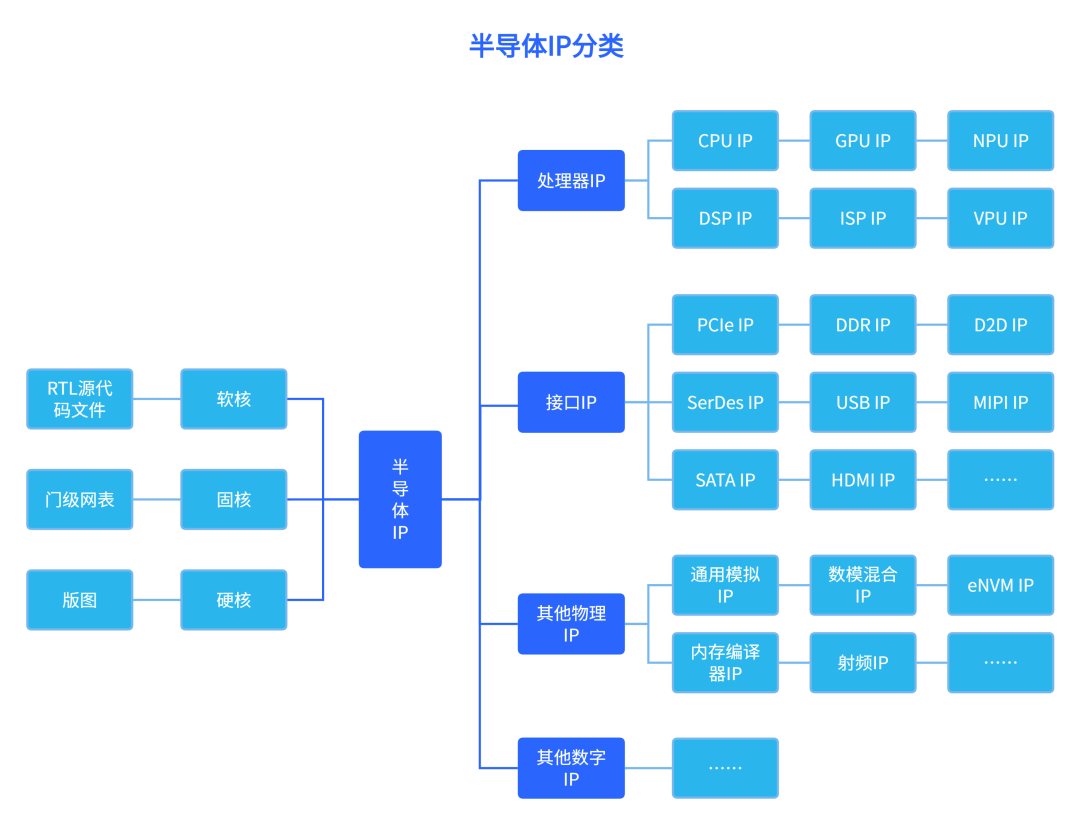 半導體IP還可以按照關(guān)鍵功能進行分類,以便于有效地發(fā)現(xiàn)和選擇,這些類別包括處理器IP、接口IP、其他物理IP、其他數(shù)字IP。其中處理器IP是半導體IP中最大市場規(guī)模的子類,主要涵蓋CPU、GPU、NPU、VPU、DSP、ISP等6類產(chǎn)品;接口IP是SoC的基本功能模塊之一,品類較多,主要包括SerDes、USB、DDR、PCIe、MIPI、SATA等;其他物理IP則包含了通用模擬IP、數(shù)模混合IP、eNVM IP、內(nèi)存編譯器IP、射頻IP等類別。